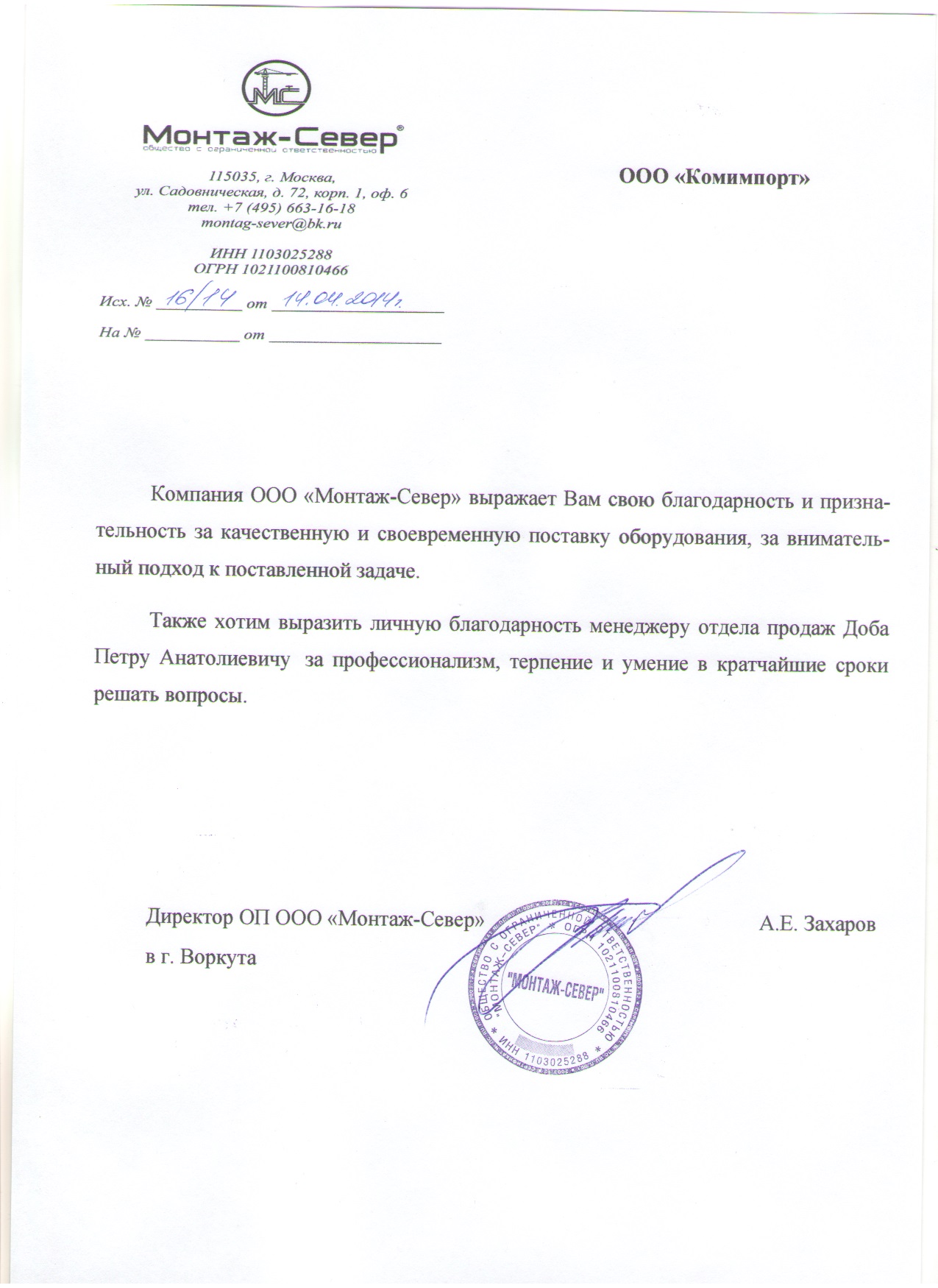 Компания ООО «Монтаж-Север» выражает Вам свою благодарность и признательность за качественную и своевременную поставку оборудования за внимательный подход к поставленной задаче. Также хотим выразить личную благодарность менеджеру отдела продаж П.А. Доба за профессионализм, терпение и умение в кратчайшие сроки решать вопросы.